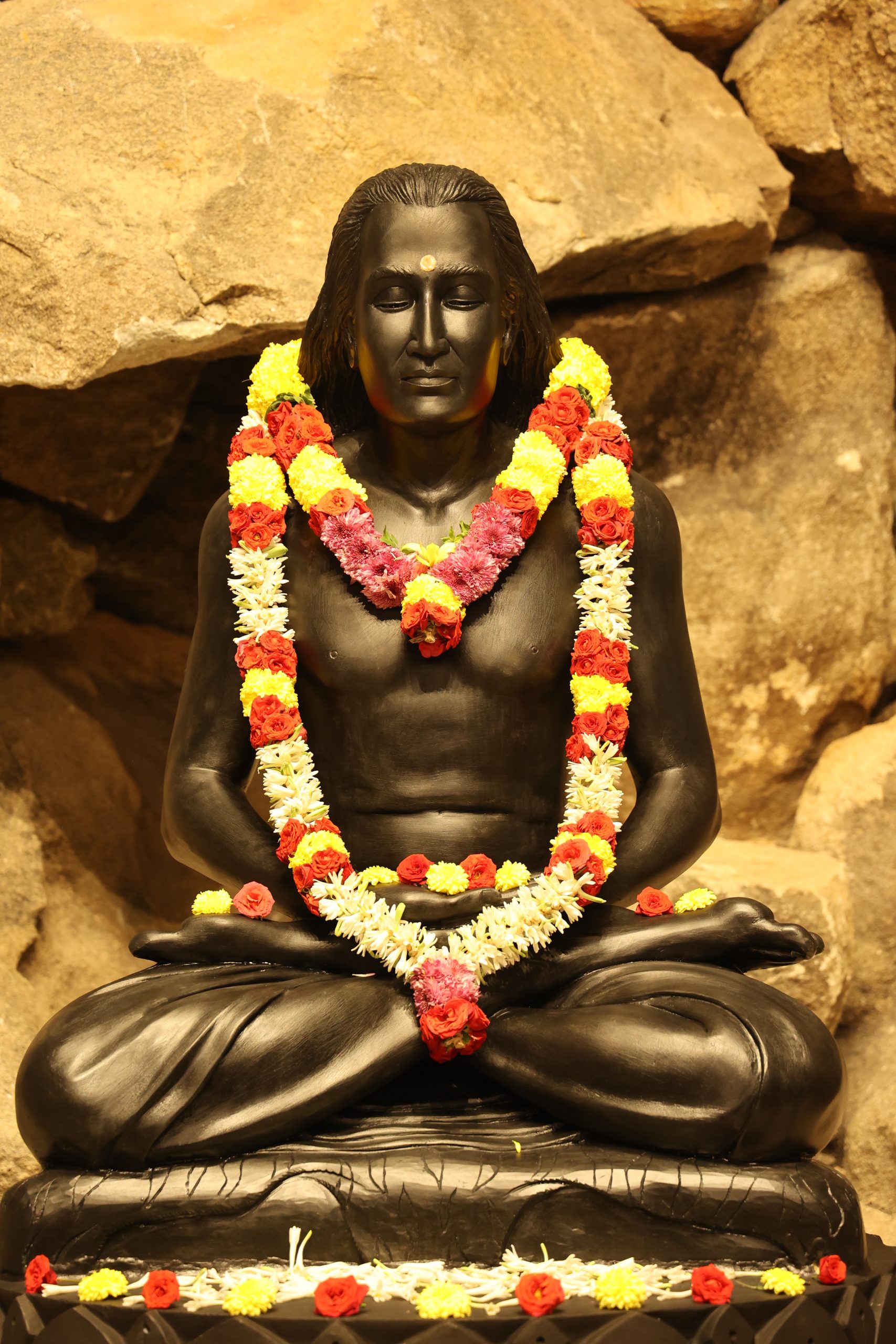 Seated in front of Sriguru Babaji is the Sri Chakra, elegantly engraved in black stone and adorned with fragrant flowers befitting her presence.